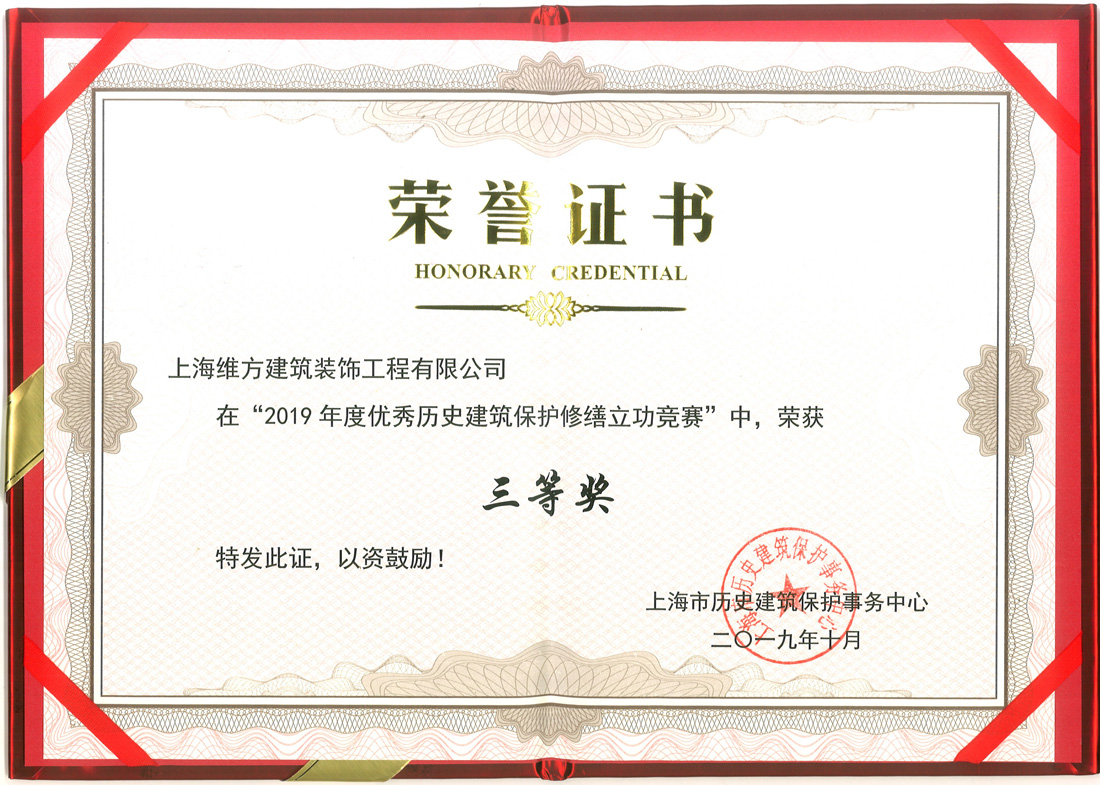 公司取得上海市2019年度優秀歷史建筑保護修繕立功競賽三等獎