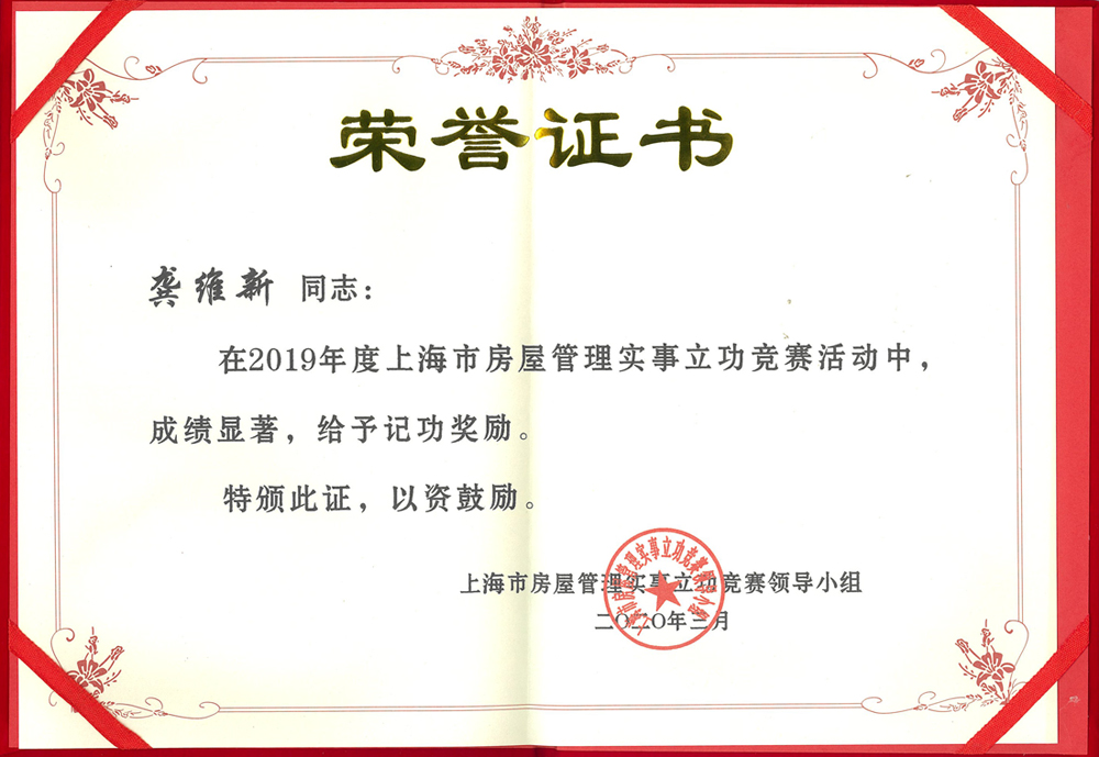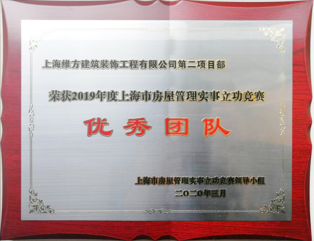 上海維方建筑裝飾工程有限公司第二項(xiàng)目部獲評2019年度上海市房屋管理事實(shí)立功競賽城市更新分賽區(qū)優(yōu)秀團(tuán)隊(duì)稱號(hào),公司總經(jīng)理獲評記功個(gè)人。